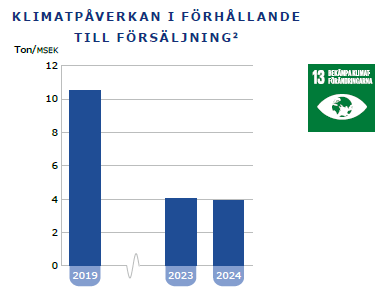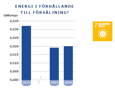 Jämfört med föregående år minskade utsläppen i förhållande till försäljning med 3 procent och 65 procent i förhållande till baslinjeåret 2018–2019. Förklaringen är ökningen av inköpt förnybar och kärnkraftsbaserad el, tillsammans med kontinuerlig förbättring i energieffektivitet.