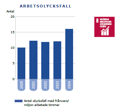 Frekvensen arbetsplatsolyckor per miljon arbetade timmar ökade under året jämfört med tidigare år. Arbetet med att minska olyckorna intensifieras för att komma tillbaka till tidigare års nivåer och på sikt minska.